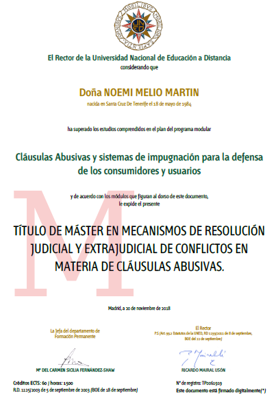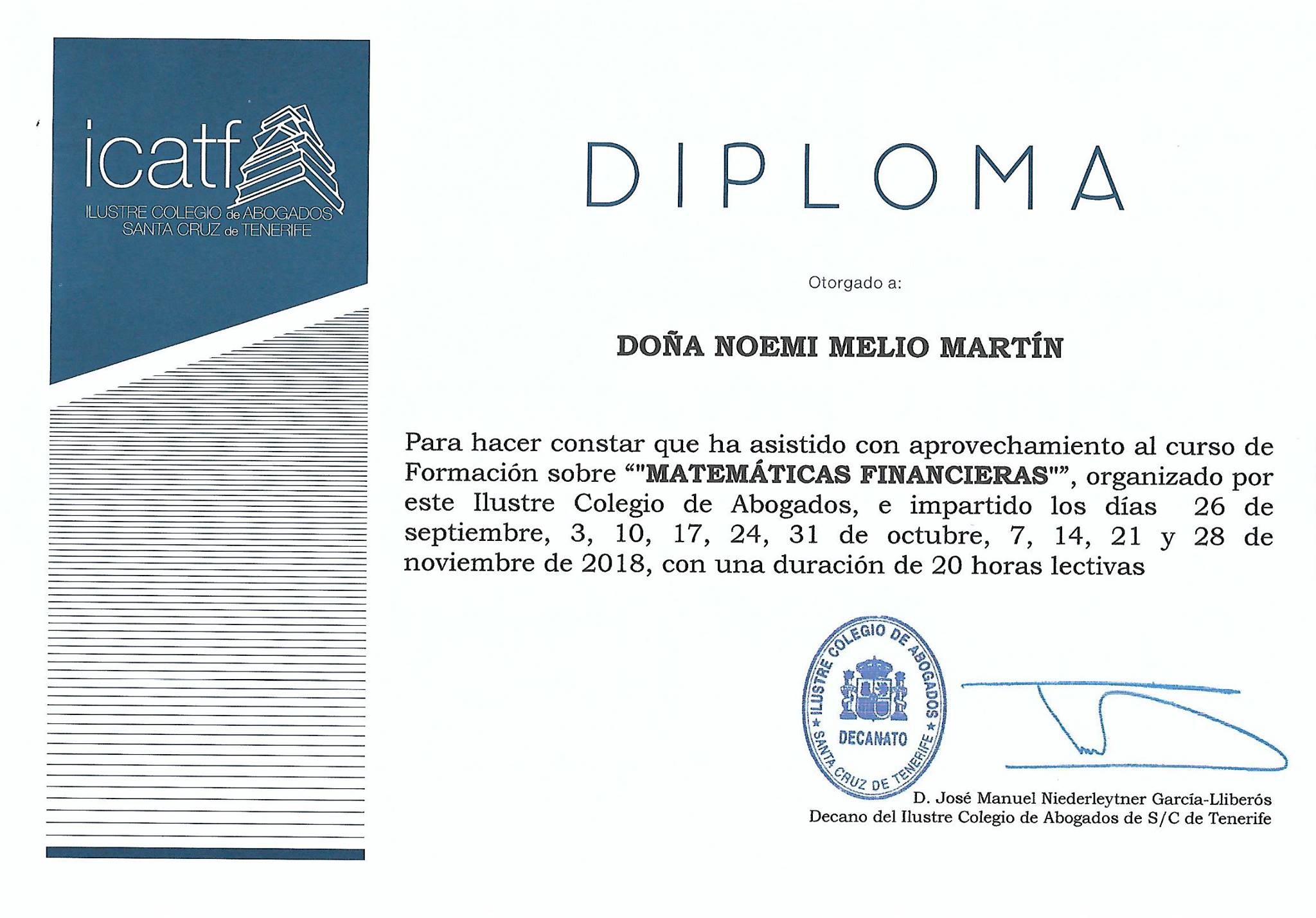 Licenciada en Derecho por la Universidad de La Laguna (promoción 2003-2007), colegiada número 4.407, de alta como abogada ejerciente desde 2007 del Ilustre Colegio de Abogados de Santa Cruz de Tenerife Completó su formación con un Curso de Escuela de Prácticas Jurídicas (2009-2011) y un Máster en Mecanismos de Resolución Judicial y Extrajudicial de Conflictos en Materia de Cláusulas Abusivas, lo que le ha permitido desarrollar una especialización única en la defensa de los derechos de los consumidores y la resolución de conflictos bancarios, siendo un despacho de referencia en la materia.